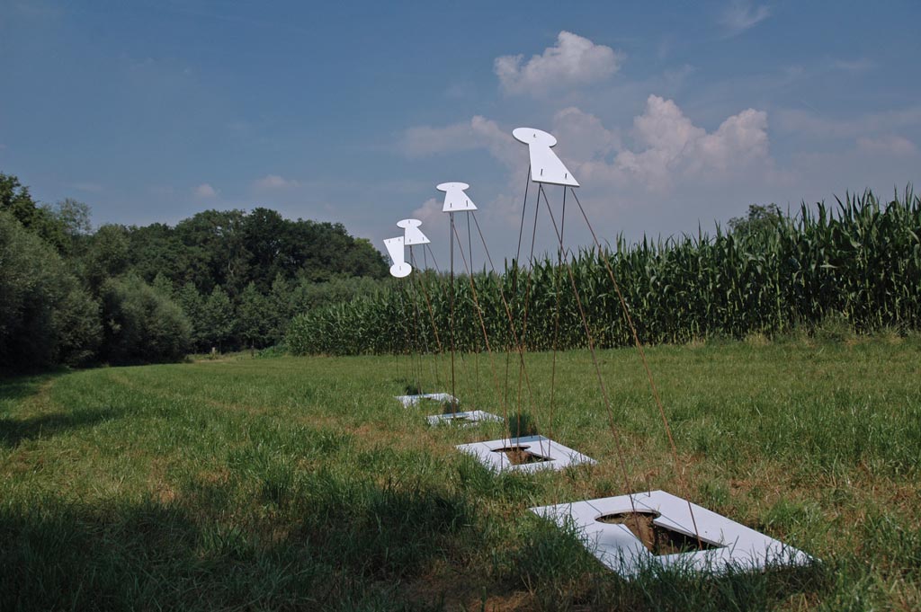 Naast schilderen en beeldhouwen, waag ik mij af en toe aan installaties. De confrontatie met de natuur en de integratie in een bepaalde site is al een uitdaging op zich.